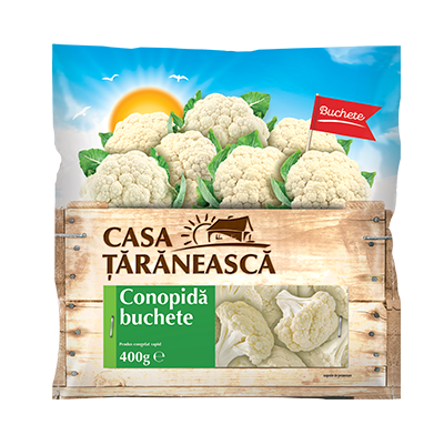 Conopidă gratinată la cuptorNu decongelați înainte de preparare. Se introduce produsul congelat într-o oală cu apă clocotită și se fierbe până când buchețelele de conopidă devin ușor fragede. Se scurge bine de apă, apoi se pune conopida într-un vas termorezistent, uns cu unt și tapetat cu pesmet. Se adaugă deasupra un amestec de smântână și cașcaval ras și se asezonează după gust. Se introduce vasul în cuptorul preîncălzit la 180°C și se coace până la formarea unei cruste aurii.Poate conține urme de țelină.